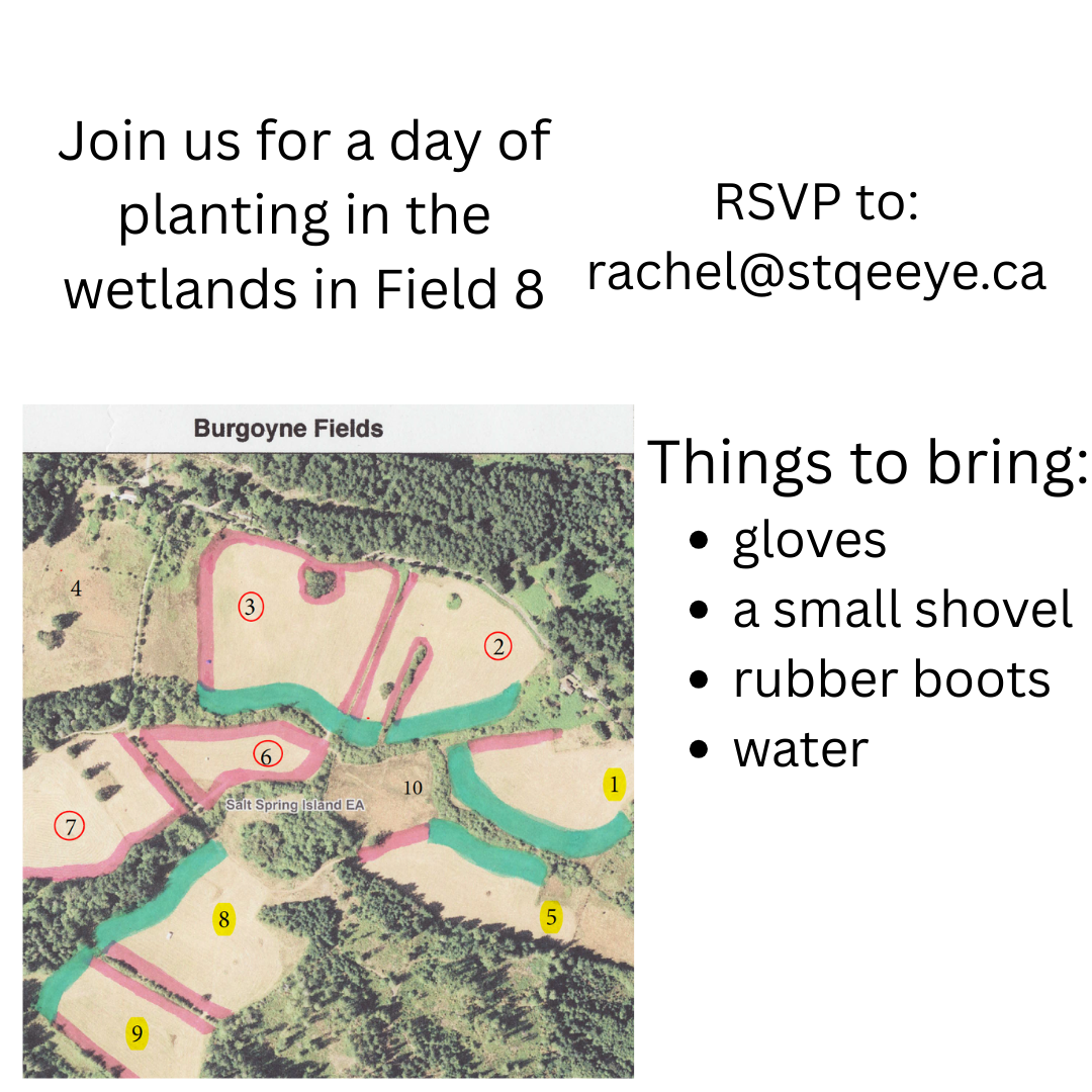 Join us Feb 2 from 9am-3pm at Xwaaqw’um to plant the remaining native plants in Fields 8 & 9. Bring gloves, boots, water, snack and a small shovel or trowel with you. Drop-in is welcome, any amount of time helping is appreciated.
